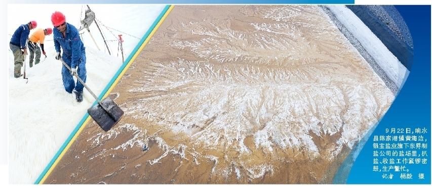 9月22日,响水县陈家港镇黄海边,银宝盐业旗下东昇制盐公司的盐场里,扒盐、收盐工作紧锣密鼓,生产繁忙。