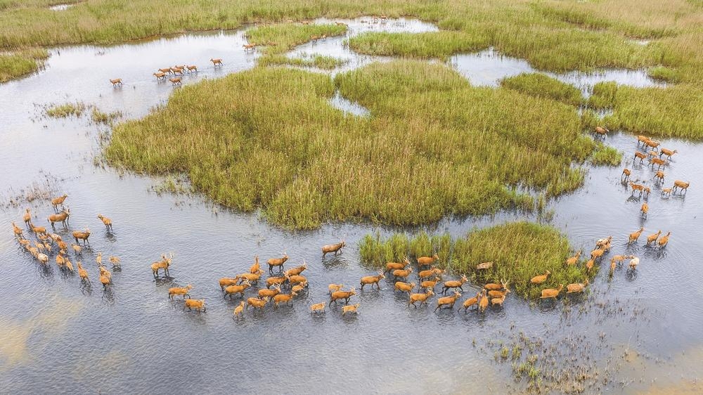 近日,野生麋鹿成群结队在射阳县黄沙港大桥北侧的湿地滩涂上尽情奔跑。近年来,射阳生态红线保护和湿地生态建设工作成效显著,好生态引得越来越多的野生动物翩然而至。